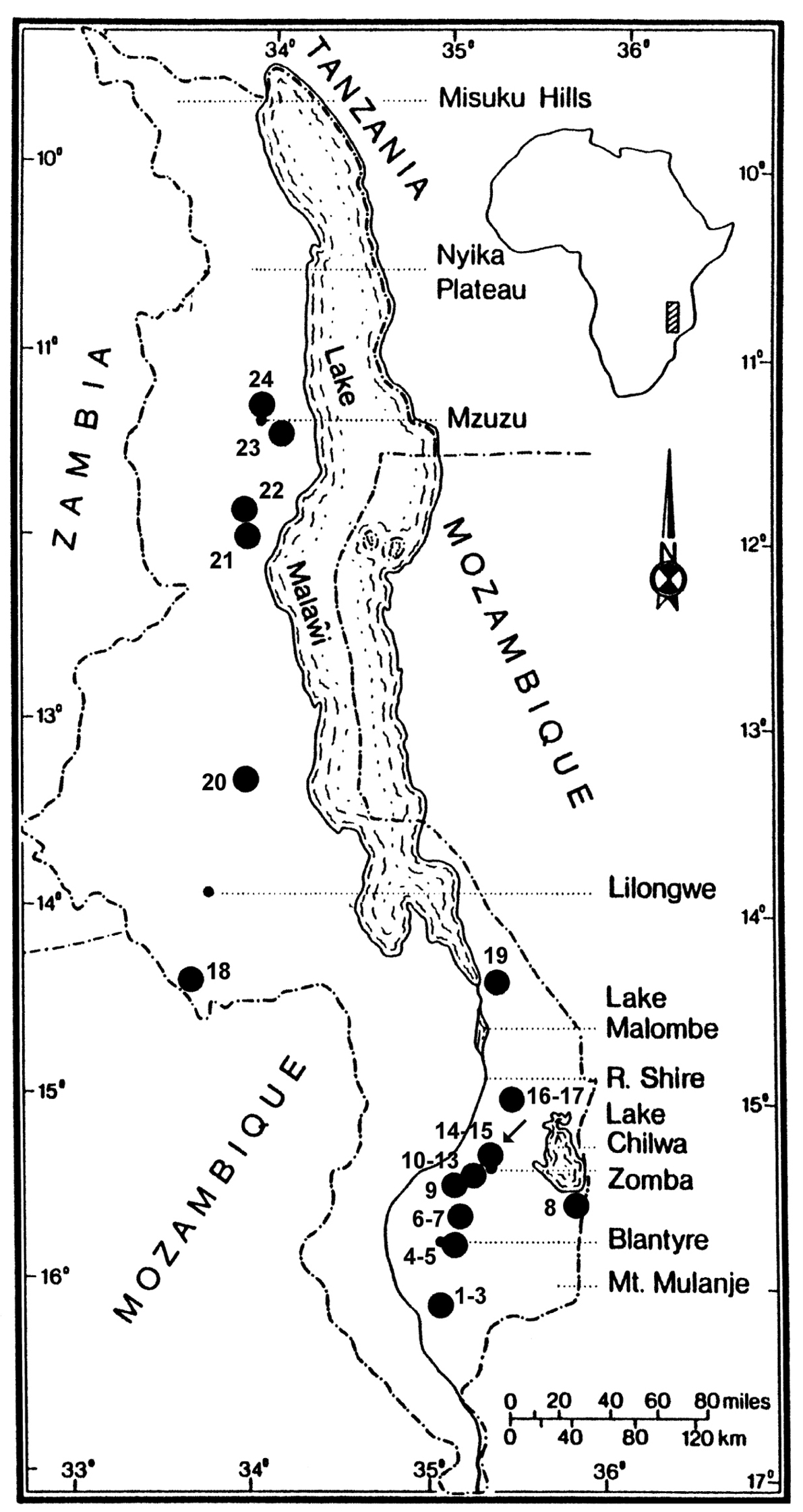 Fig. 6. Map of Malaŵi showing the distribution of Gulella streptostelopsis spec. nov. For numbers refer to ‘Material examined’. The arrow indicates the type locality. |