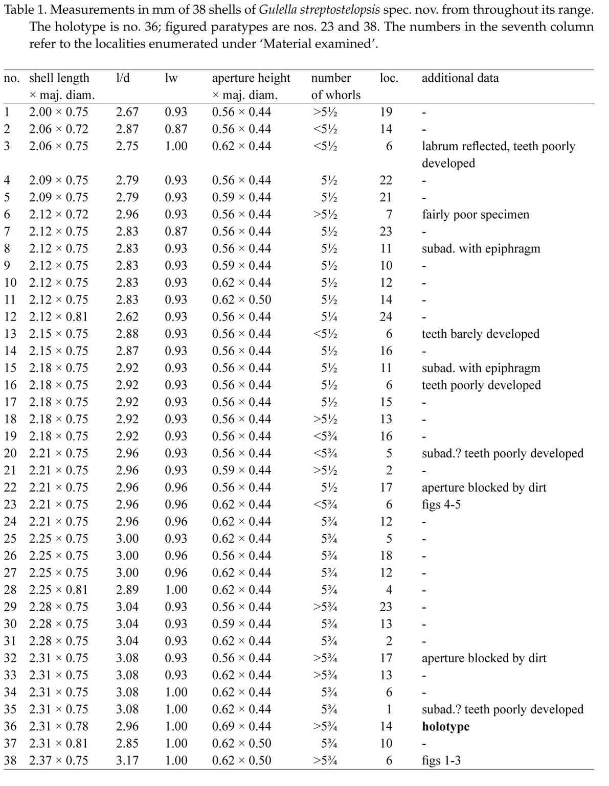 The shell of G. streptostelopsis spec. nov. is subject to some variation in dimensions as shown by table 1. The abundant material allowed for a check on clinal variation. However, it appears that there is no discernible geographical pattern in the measurements of the shell of the new species. Both small and large shells derive from southern populations and to a slightly lesser degree this also applies to northern populations. As regards size it is not always easy to decide what shells are really adult, vide loc. 5 in table 1 (shells nos. 20 and 25). This sample consists of three shells, (a) a juvenile, 2.0 mm long and with 5 ¼ whorls, but with developed apertural teeth and reflected labrum; (b) a subadult, 2.21 mm long and with <5¾ whorls (no. 20 in table 1) with poorly developed dentition and labrum; (c) an adult, 2.25 mm long and with 5¾ whorls (no. 25 in table 1) with properly developed dentition and labrum.