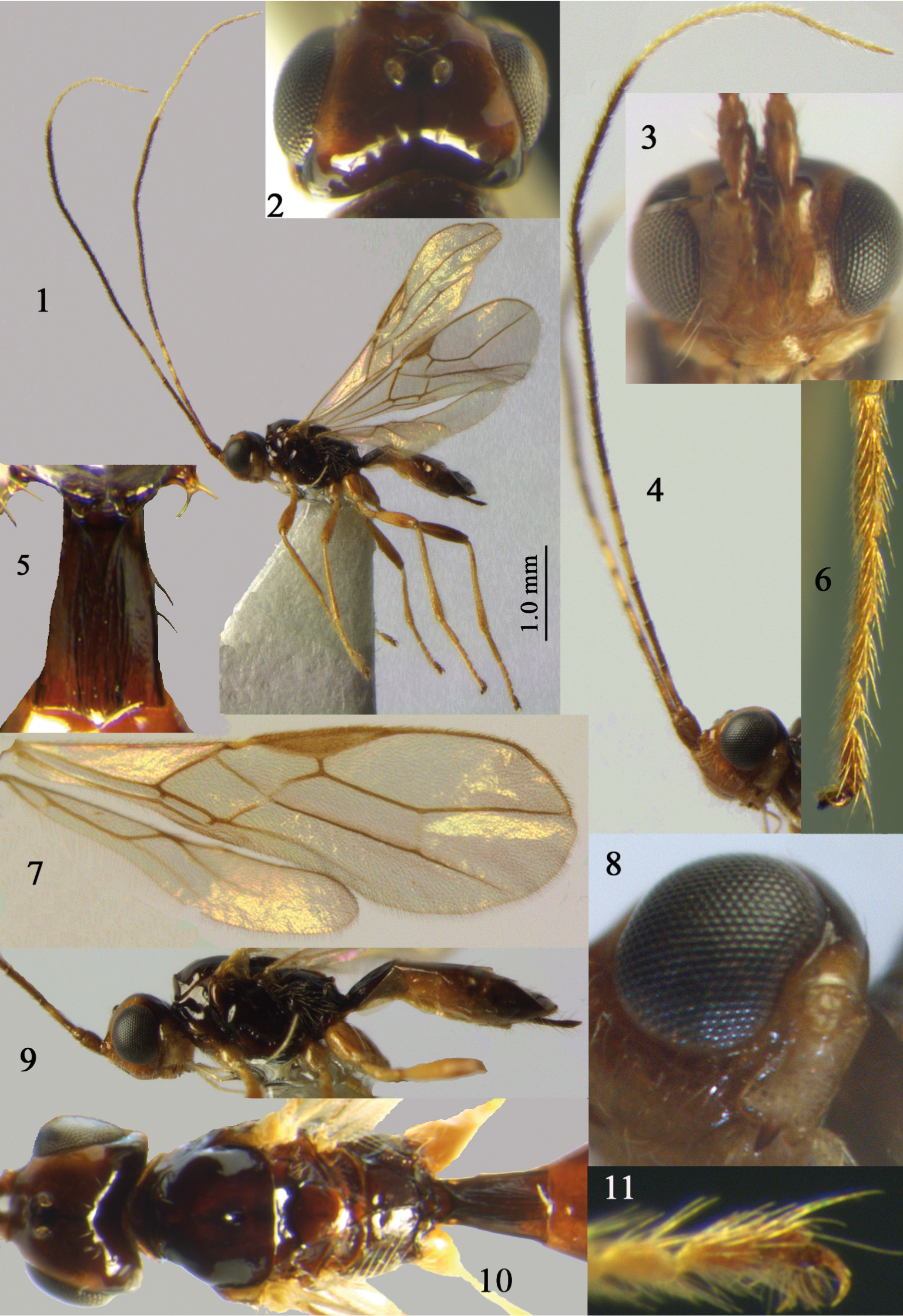 Colour.— Dark chestnut brown (figs 1, 2, 10); 4 basal segments of antenna brown (but third segment partly yellowish), 5th-7th or -8th segments ivory, 9th-21st segments dark brown and 22nd-31st segments white (fig. 4); face, frons and vertex laterally, temple near base of mandible, pronotum ventrally, propleuron, telotarsi, hind coxa, most of femora, apex of tibiae and metasoma ventrally yellowish-brown; clypeus, mandible, propleuron, tegulae, remainder of legs and palpi pale yellowish; metasoma dorsally (except first tergite) rather dark brown; pterostigma and veins brown; wing membrane slightly infuscate.