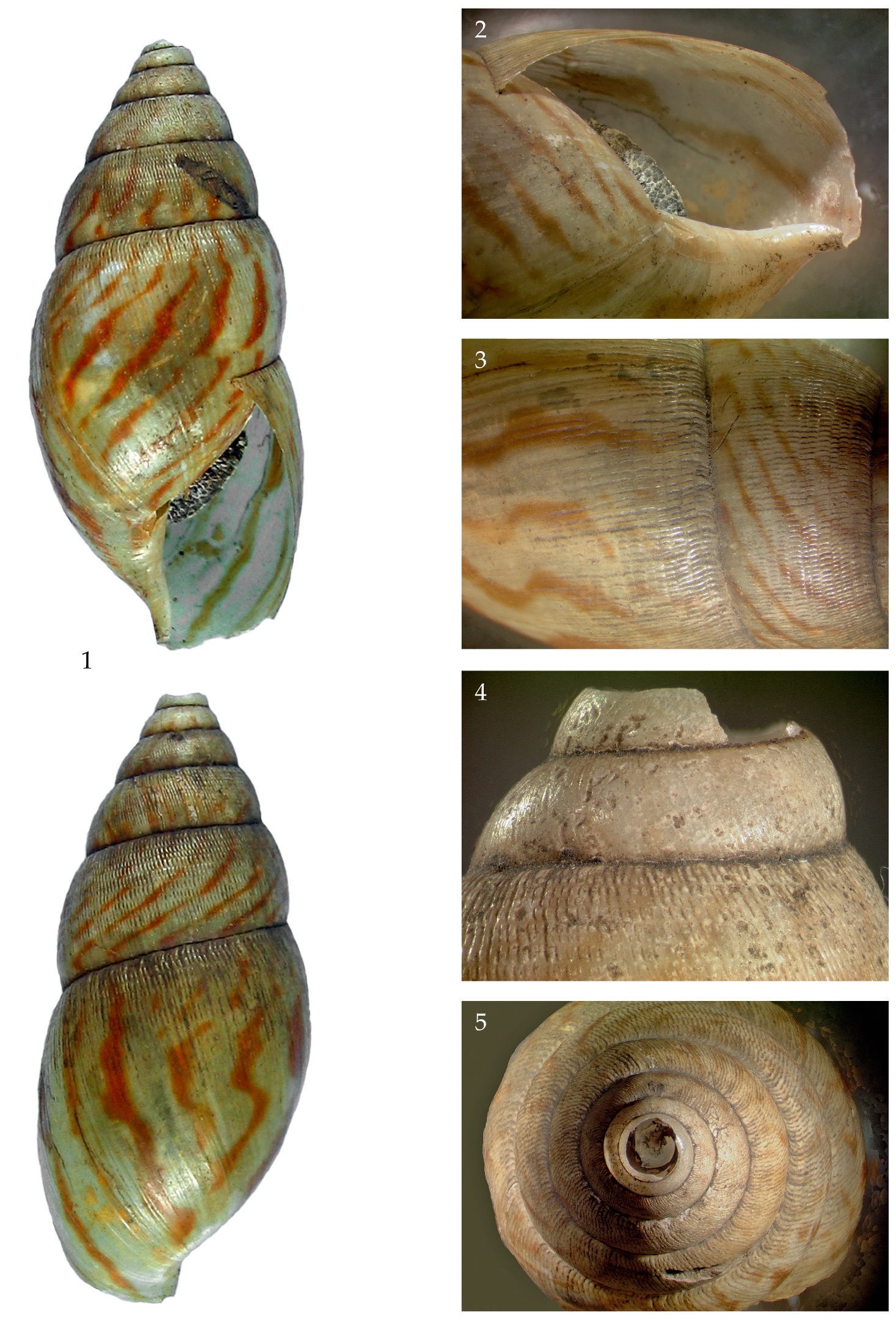 Figs 1-5. Different views of the holotype of ‘Achatina’ vassei Germain, 1918 (MNHN, Mollusca No. 21490): Andrada, Mozambique. Note shape and sculpture; actual length/height 40.5 mm (apical whorls lost). Photographs Dr Ben Rowson (National Museum of Wales, Cardiff). |