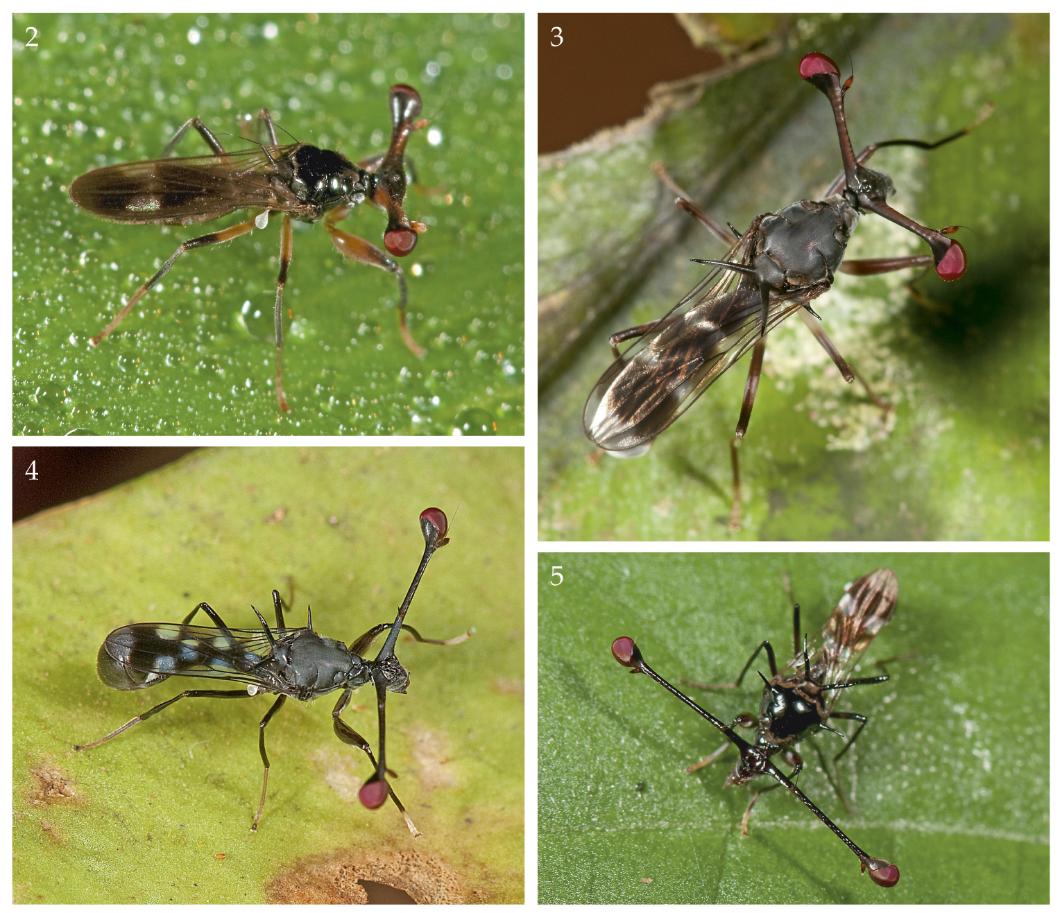 Figs 2-5. Photographs of life Philippine diopsids by Dr. Steve Marshall. 2, Sphyracephala nr detrahens, Los Banos, 15.iii.2010; 3, Eurydiopsis subnotata (Westwood, 1848), Pakil, Laguna, 24.iii.2010; 4, Teleopsis pharao Frey, 1928, Pakil, Laguna, 2.iv.2010; 5, Teleopsis nitidiscutum spec. nov. Los Banos 15.iii.2010. Note that the lateral thoracic spines in the Eurydiopsis are metapleural spines while those in the Teleopsis are supra-alar spines. This can be considered a case of convergent evolution. |