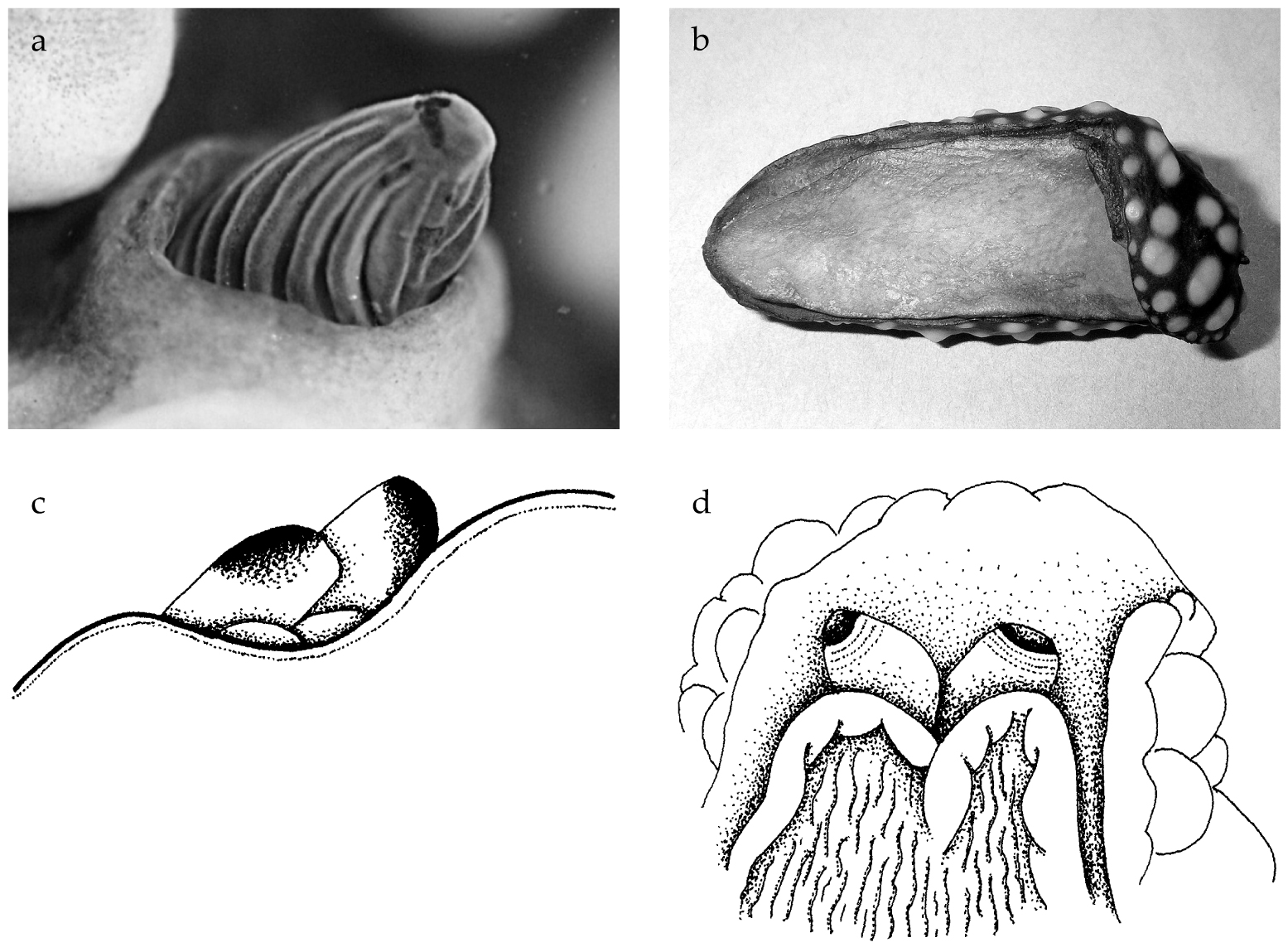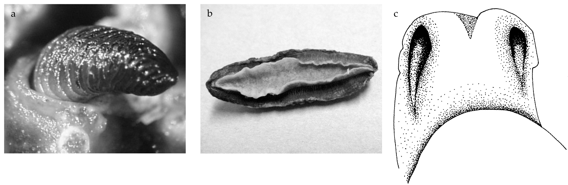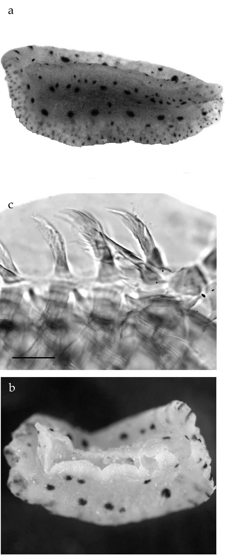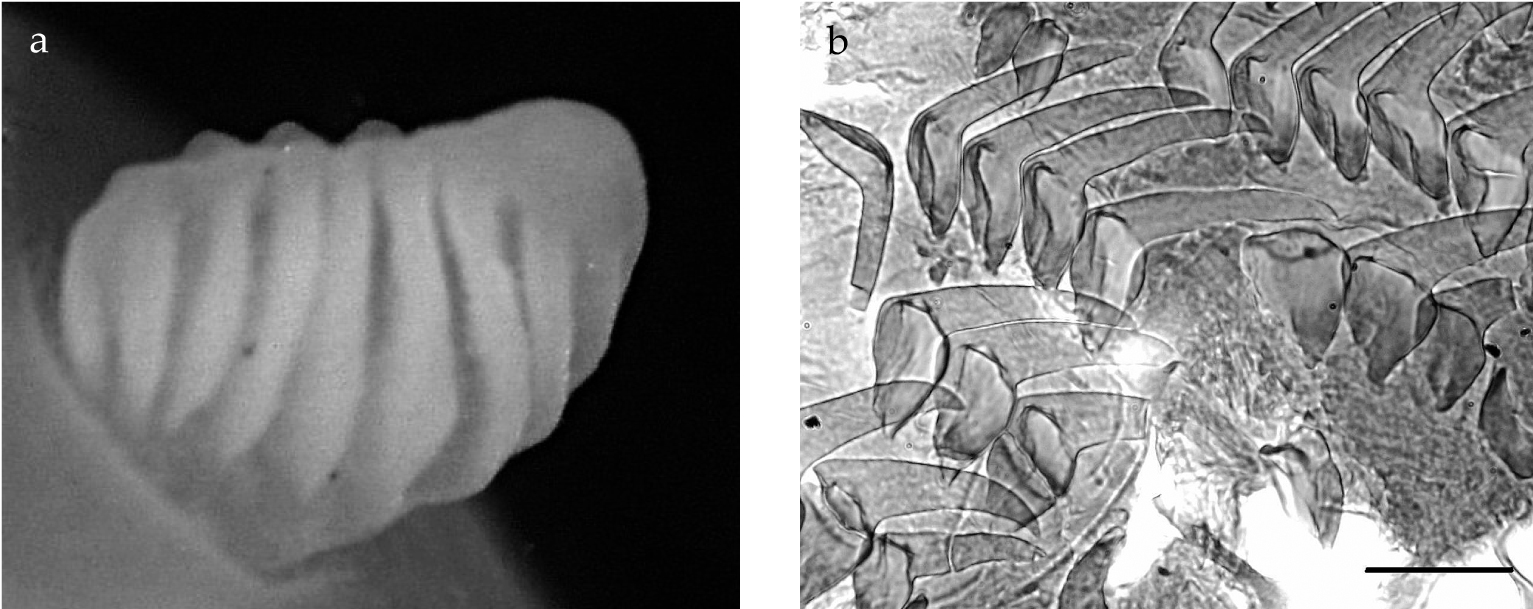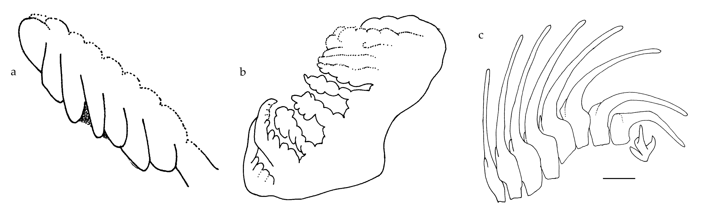 The preserved specimen is cream in colour, with the seven dorsal wrinkles opaque cream. The anterior portion of the animal and the fourteen gill leaflets are extended (fig. 3a), but the posterior portion of the body is contracted. The foot and the mantle are squared anteriorly; the wide foot margin is contracted to a thick rope. There was a small white parasitic copepod egg case on the gills, but it fell off before it could be photographed. The tiny radula has a formula of 11-12 × 21.1.0.1.21. The teeth are typical of the genus Analogium in having short bases with very long hooks; the small first lateral has a relatively large base with a hooked cusp (fig. 3b, c).