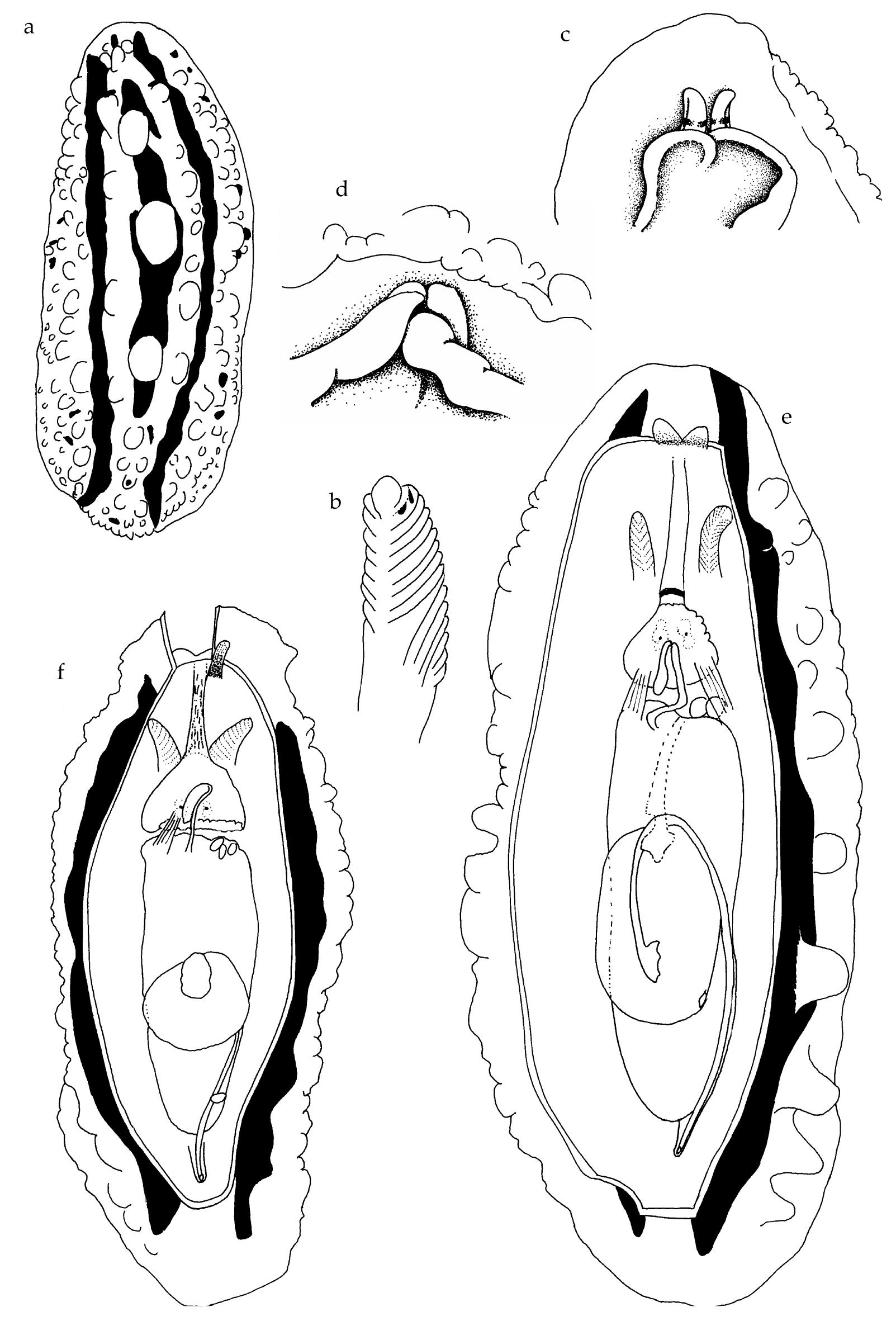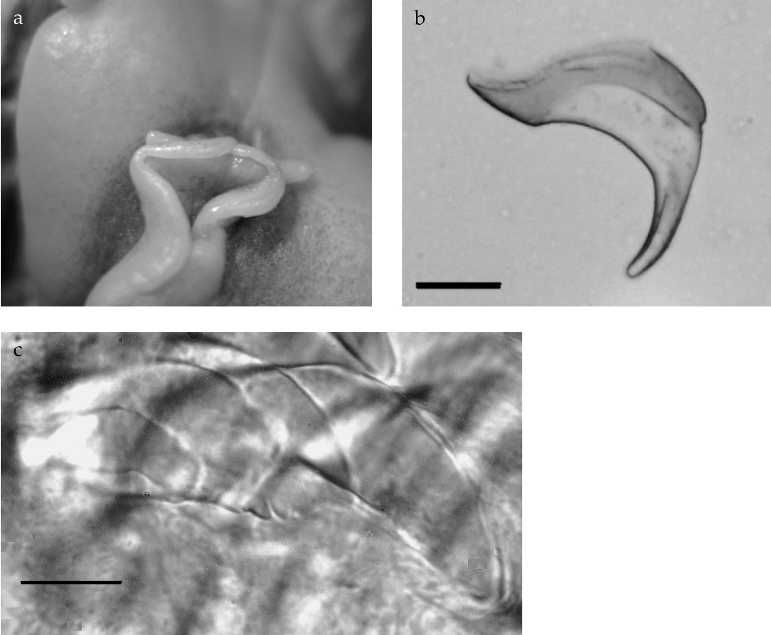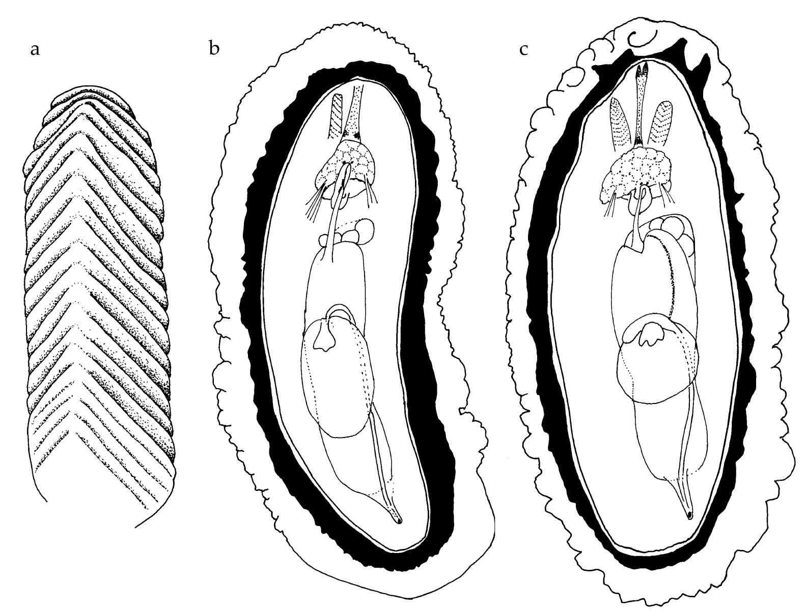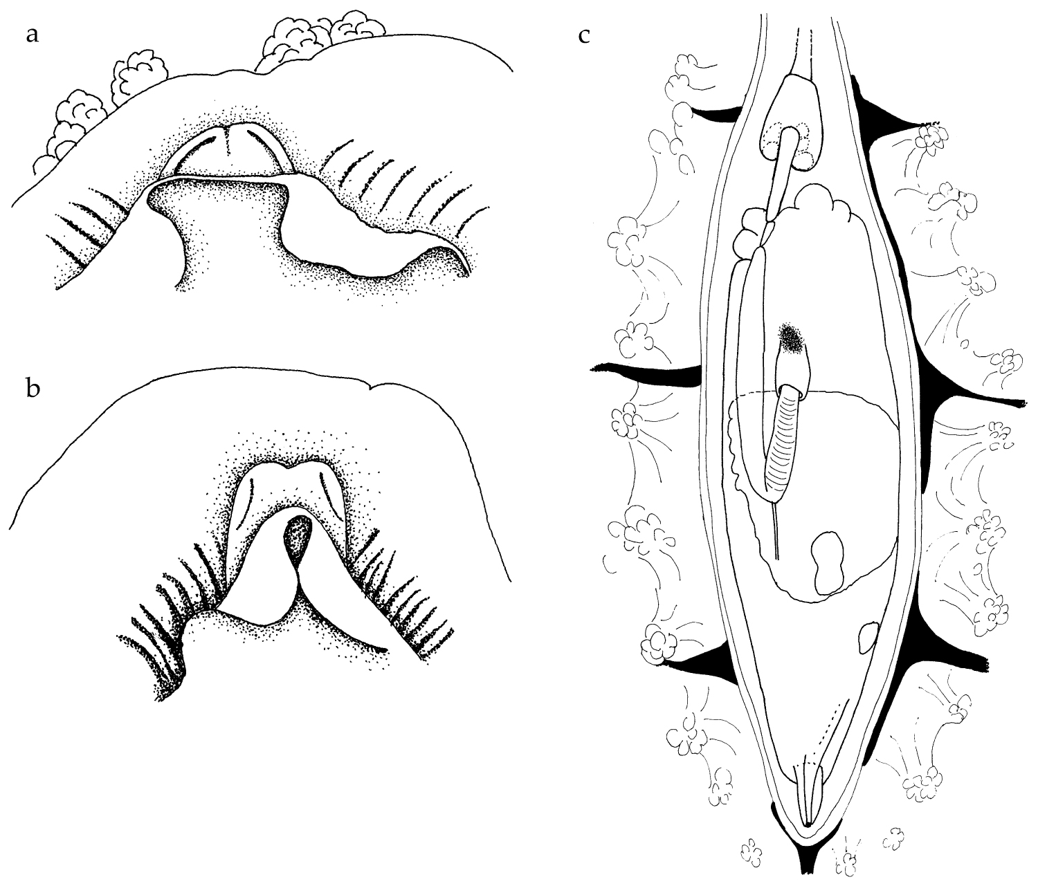 The preserved specimen is cream in colour, with the seven dorsal wrinkles opaque cream. The anterior portion of the animal and the fourteen gill leaflets are extended (fig. 3a), but the posterior portion of the body is contracted. The foot and the mantle are squared anteriorly; the wide foot margin is contracted to a thick rope. There was a small white parasitic copepod egg case on the gills, but it fell off before it could be photographed. The tiny radula has a formula of 11-12 × 21.1.0.1.21. The teeth are typical of the genus Analogium in having short bases with very long hooks; the small first lateral has a relatively large base with a hooked cusp (fig. 3b, c).