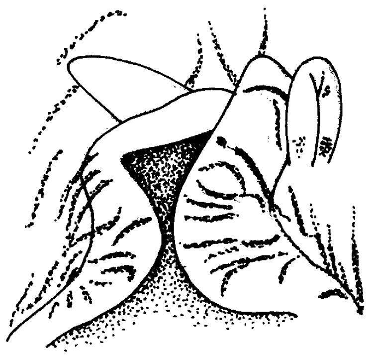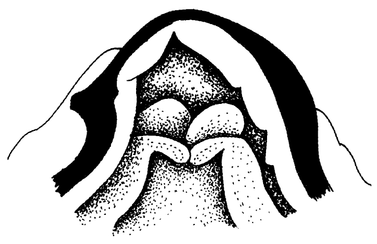 In the preserved specimen, the blue line on the head and oral tentacles is still present as a dense band and internally, there is a blue band remaining on the oral tube. The radula was examined and has the formula > 13 × 1.1.1.1.7-8. It is deformed, missing all but one marginal tooth on the left side. The rachidian bears five regular denticles on the cusp and is broadest below these, tapering to the slightly rounded base (fig. 2). Unlike those of Nembrotha lineolata (p. 909), the denticles are approximately equal in size and are not joined at their bases. The rachidian teeth are broader than they are high. The first lateral is typical for the genus, very large with a broad base and hooked cusp; the marginal teeth are small rectilinear plates decreasing in size along the row.