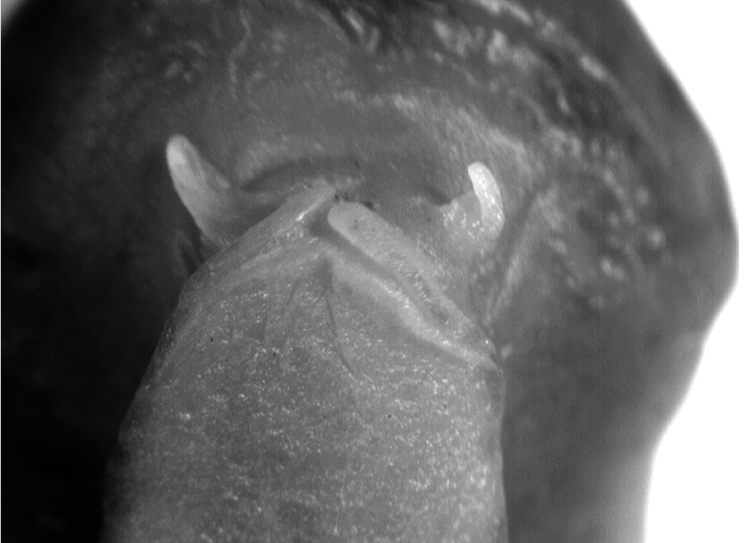 The preserved specimen is minute and appears to have partially dried out at some point. The buccal bulb projects out of the mouth (also visible in pl. 3 fig. 2), and the conical genital papilla is located below and behind the right rhinophore. The elongated rhinophores have six overlapping diagonal lamellae and a round terminal knob (fig. 4a). The gills are all united basally and each branch is simply pinnate (fig. 4b). The radula is missing but some pieces and a few teeth were obtained from the storage vial, appearing form a complete half row of 8-9 teeth (fig. 4c). The first lateral differs from the remainder, small with three spikes on the end; the larger second tooth is bent in the middle, nearly 90o; the remaining teeth straighten along the row and have a small square base with a long cusp. The second and remaining laterals have a small peg at the base where the cusp meets the base; this becomes smaller near the end of the row.