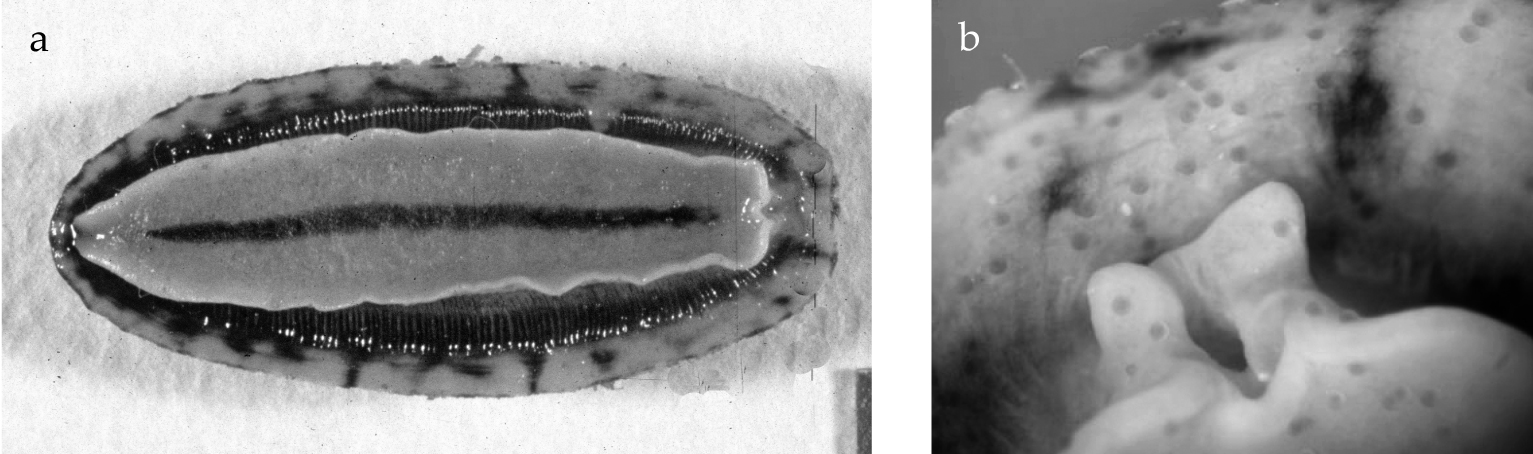 Fig. 4. Platydoris cinereobranchiata Dorgan, Valdés, & Gosliner, 2002, RBE stn 23, Hitu, 60 mm preserved, photo M. Lavaleye. Black lines point to red areas of the foot and hyponotum.