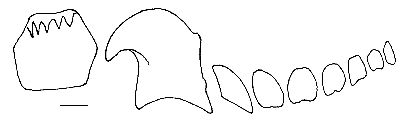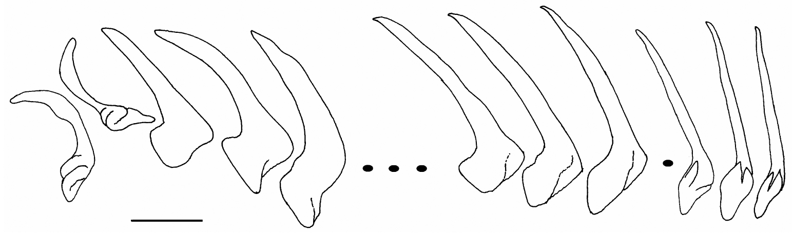 Fig. 5. Gymnodoris aurita. Selected radular teeth of 35 mm specimen: left and right first lateral, laterals 2-4, 25-27, and 31-33, photographed from near the new edge. Scale bar 50 µm. |