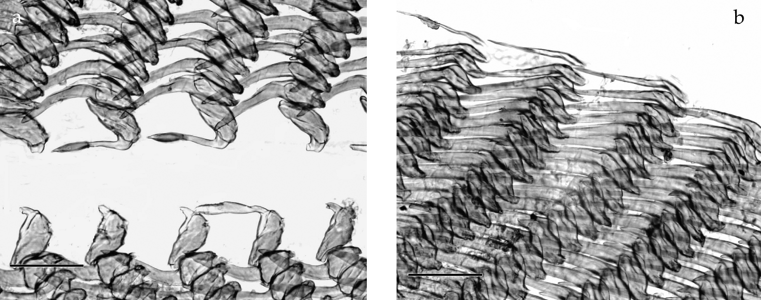 Fig. 1. Nembrotha lineolata. Radular teeth of 20 mm specimen. Scale bar 50 µm.Trevelyana cristata Bergh, 1874: pl. 33, fig. 6. |
