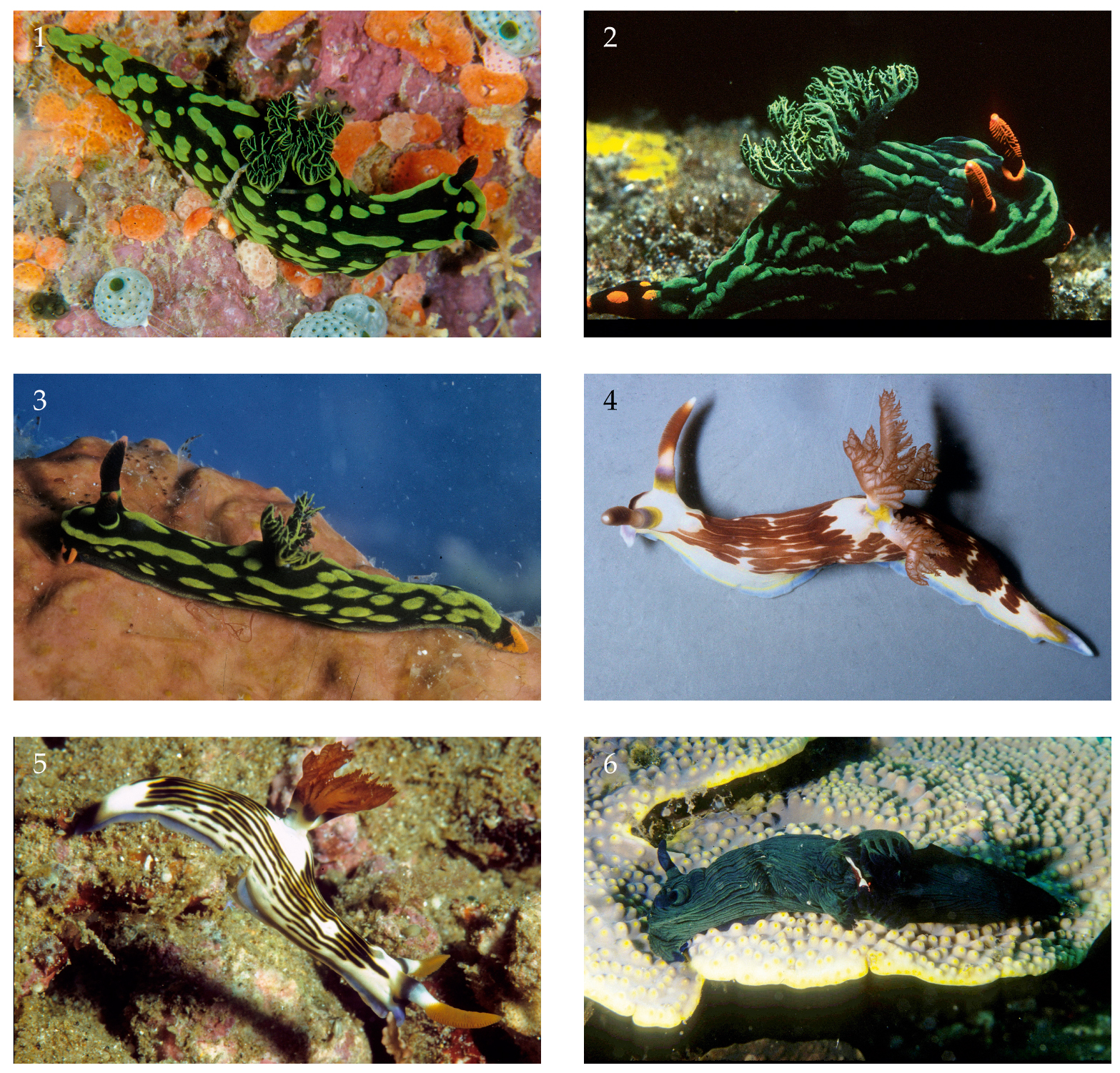 Remarks.— These records of N. milleri are unfortunately based only on photographs: they were dark velvety green with longitudinal black creases along the body which also ran up the gill bases. The rhinophore sheaths and gills were green basally, but with green-edged black lamellae. A Periclimenes sp. shrimp was noted living within the gills (pl. 1 fig. 6). Tonozuka (2003) also provides a photo taken south of Sulawesi showing two Periclimenes sp. on N. milleri. No other species is similar: N. cristata (p. 907) is also green and black but the ground colour is black, not green as in N. milleri. Nembrotha kubaryana (p. 908), which can have a green linear pattern on black but is more usually spotted, has brighter green markings and additional bright orange margins.